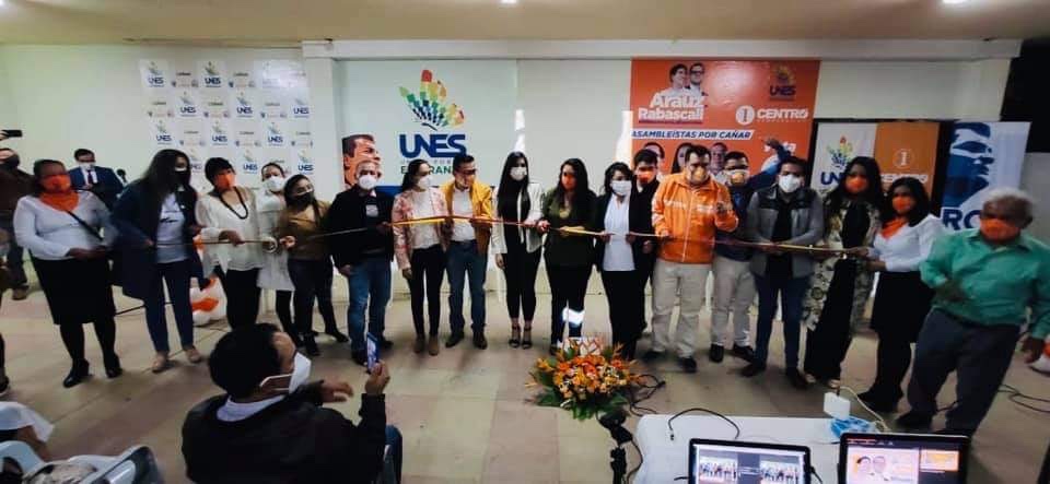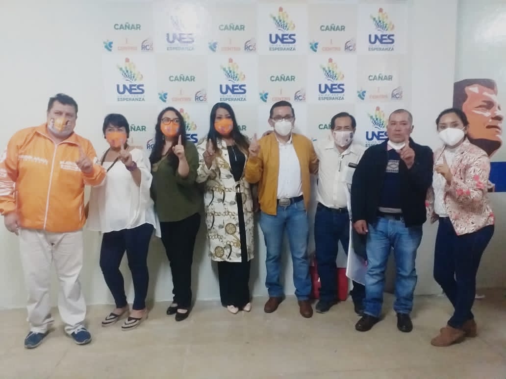 Cortando la cinta de inaguracion de la sede de UNES Cañar, con los directores provinciales y los candidatos Asambleístas.